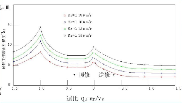 隨著砂輪每轉進給量的增加,一般說來,粗糙度也會增大,而且這種增大,在順修時要比逆修時劇烈得多,但隨著光修轉數的增多,進給量對粗糙度的影響逐漸消失。